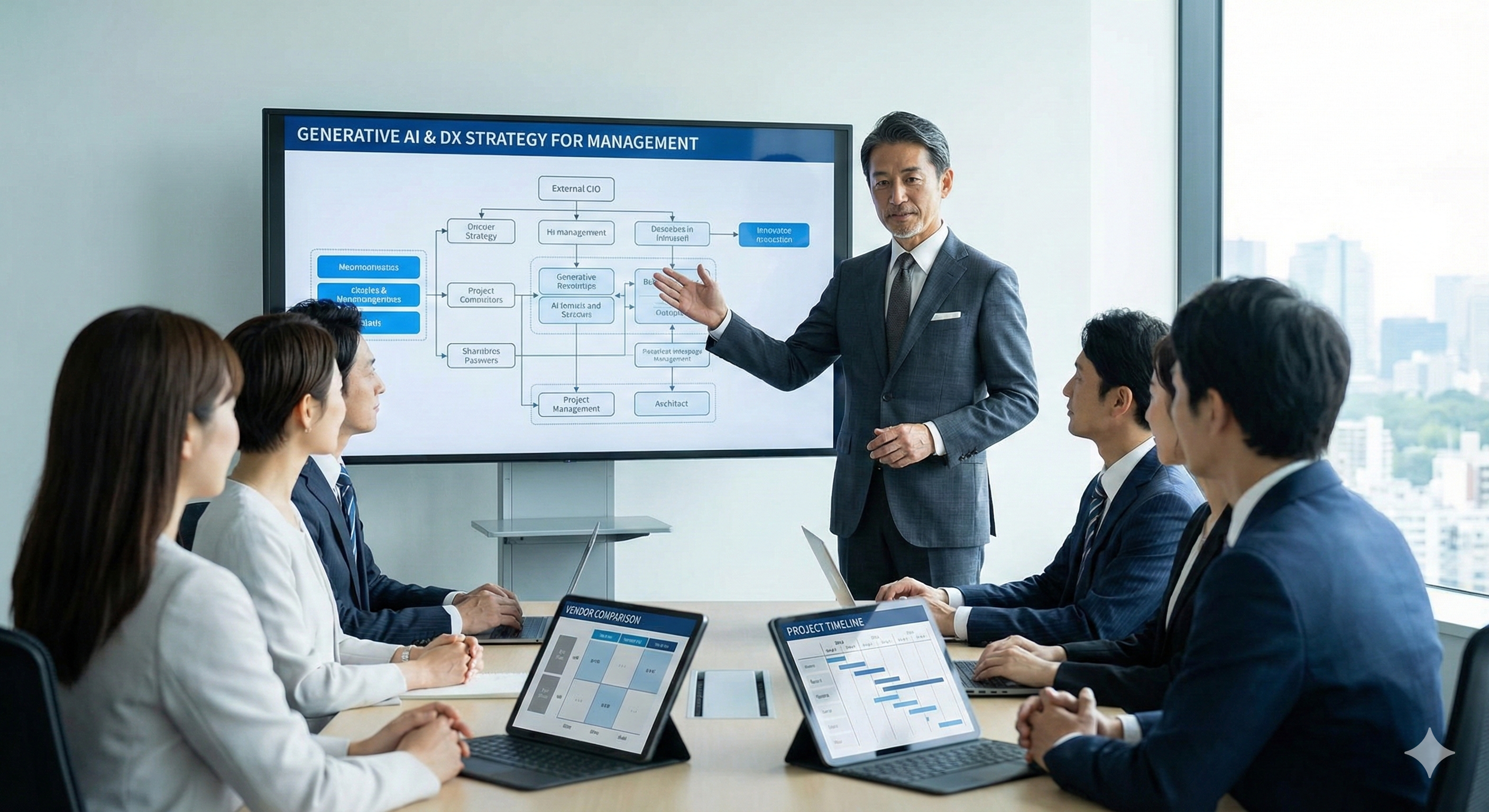 「社外CIO」として、最新のAIトレンドを御社の経営に取り入れます。ベンダー選定から運用まで伴走します。